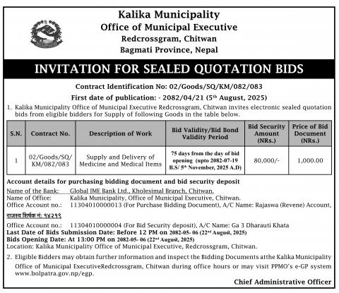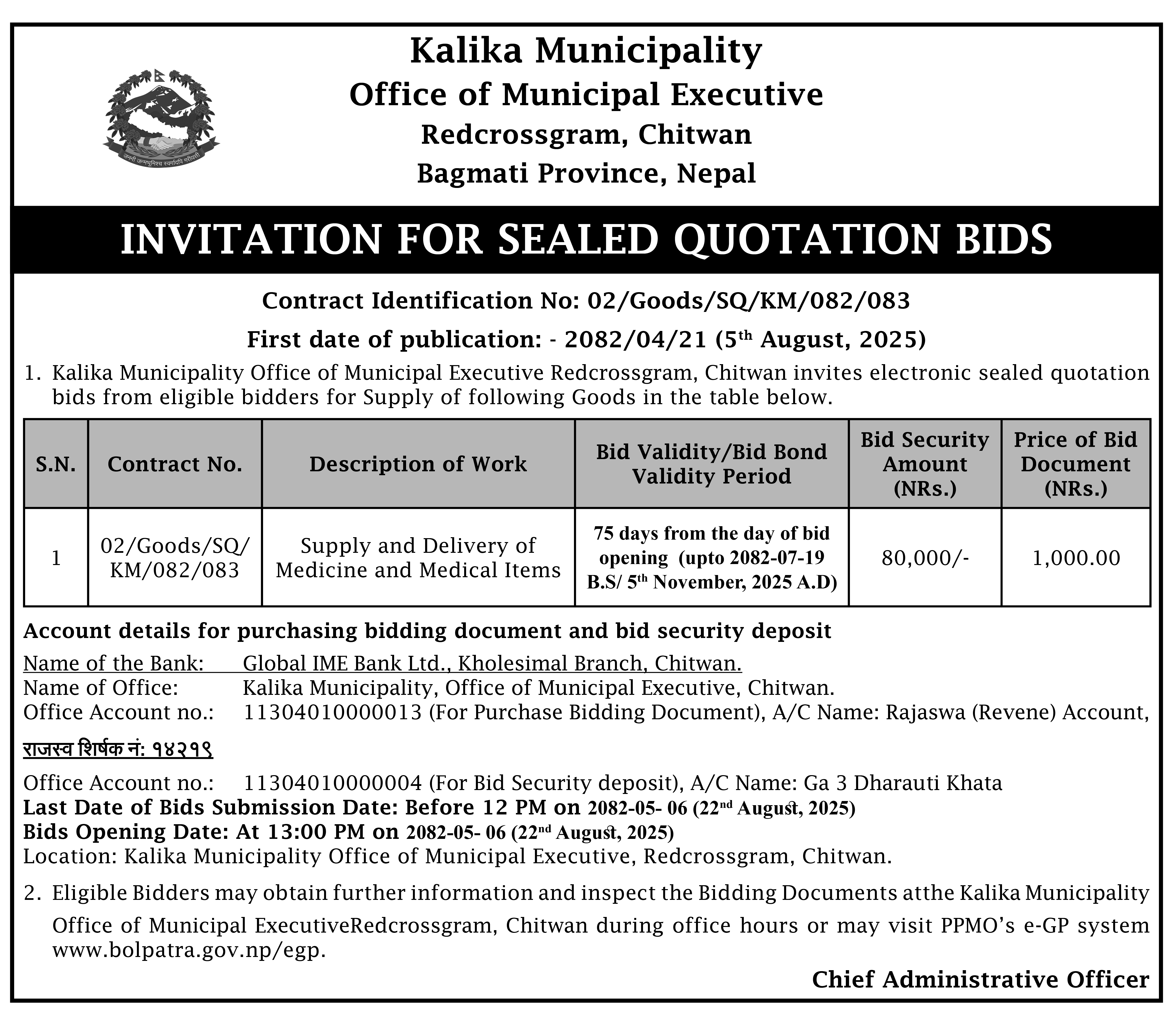 Invitations for sealed bids for supply and delivery of lab reagent and lab materials for Kalika Nagar Hospital.