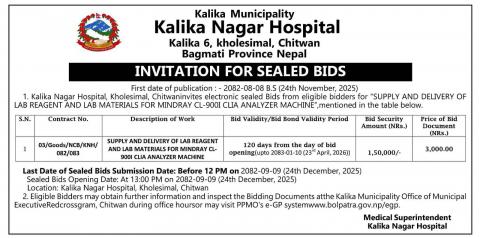 Invitations for sealed bids for supply and delivery of lab reagent and lab materials for Kalika Nagar Hospital.