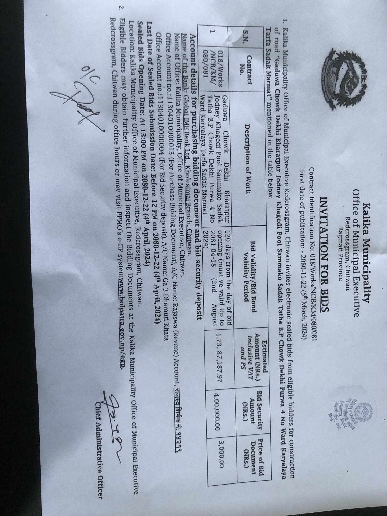 Invitation for bids for construction of road " Gaduwa chowk dekhi bharatpur jodney khagedi pool sammako sadak tatha bp chowk dekhi purwa 4 no ward karyalaya tarfa sadak marmat".