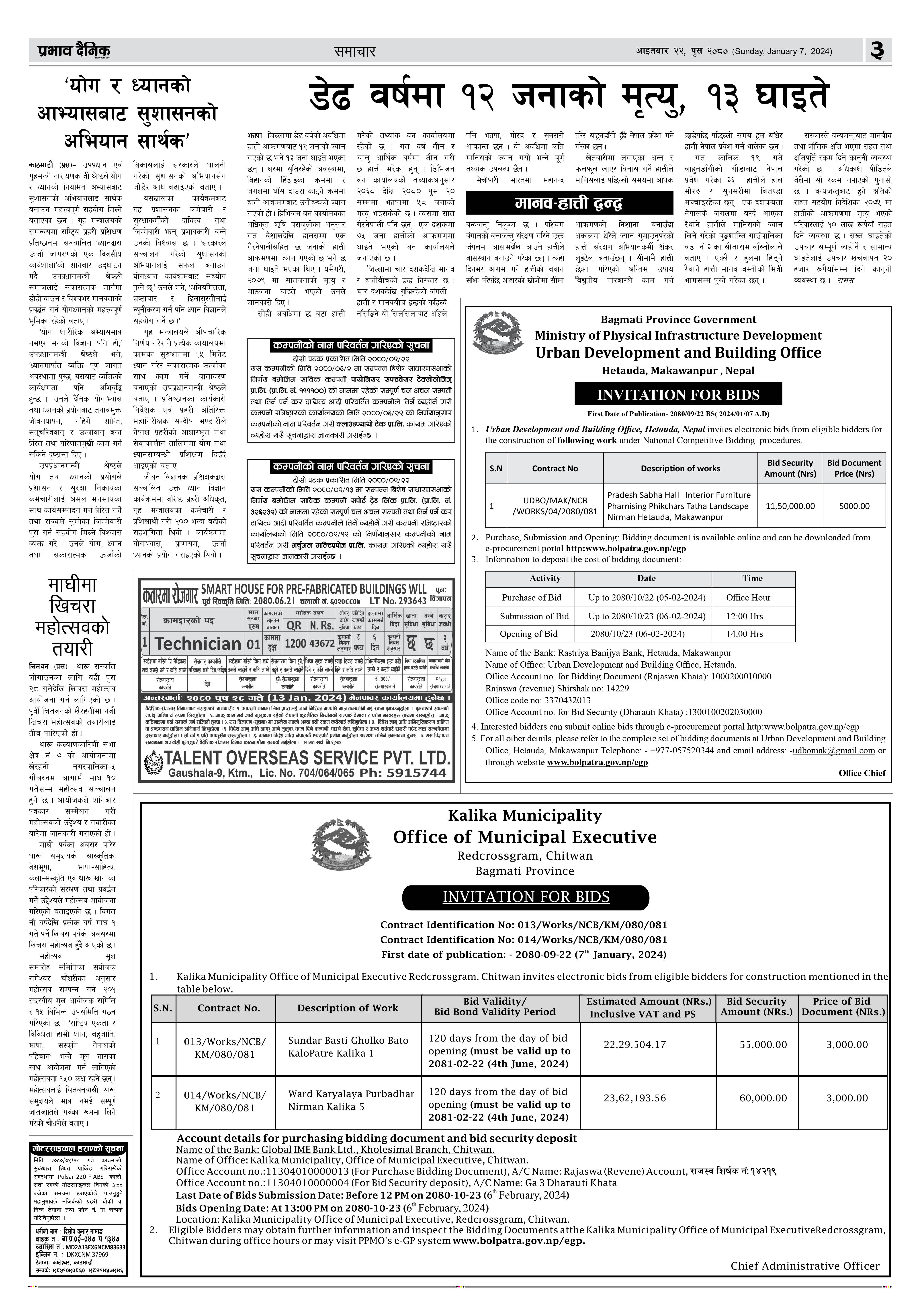 Invitations for bids for construction of Kalika Mandir compound wall, Kalika-08.