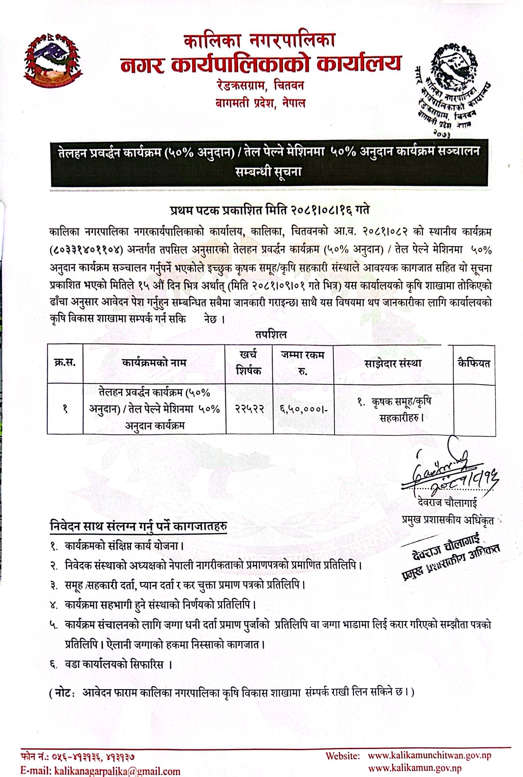 तेलहन प्रवर्द्धन कार्यक्रम(५०%) अनुदान/तेल पेल्ने मेशिनमा ५०% अनुदान कार्यक्रम सन्चालन सम्बन्धी सूचना।