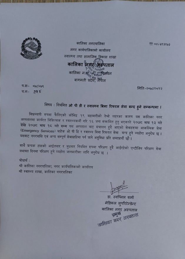 मासिक पाँच हजार उपचार खर्च सम्बन्धमा स्वास्थ्य शाखाको सूचना।