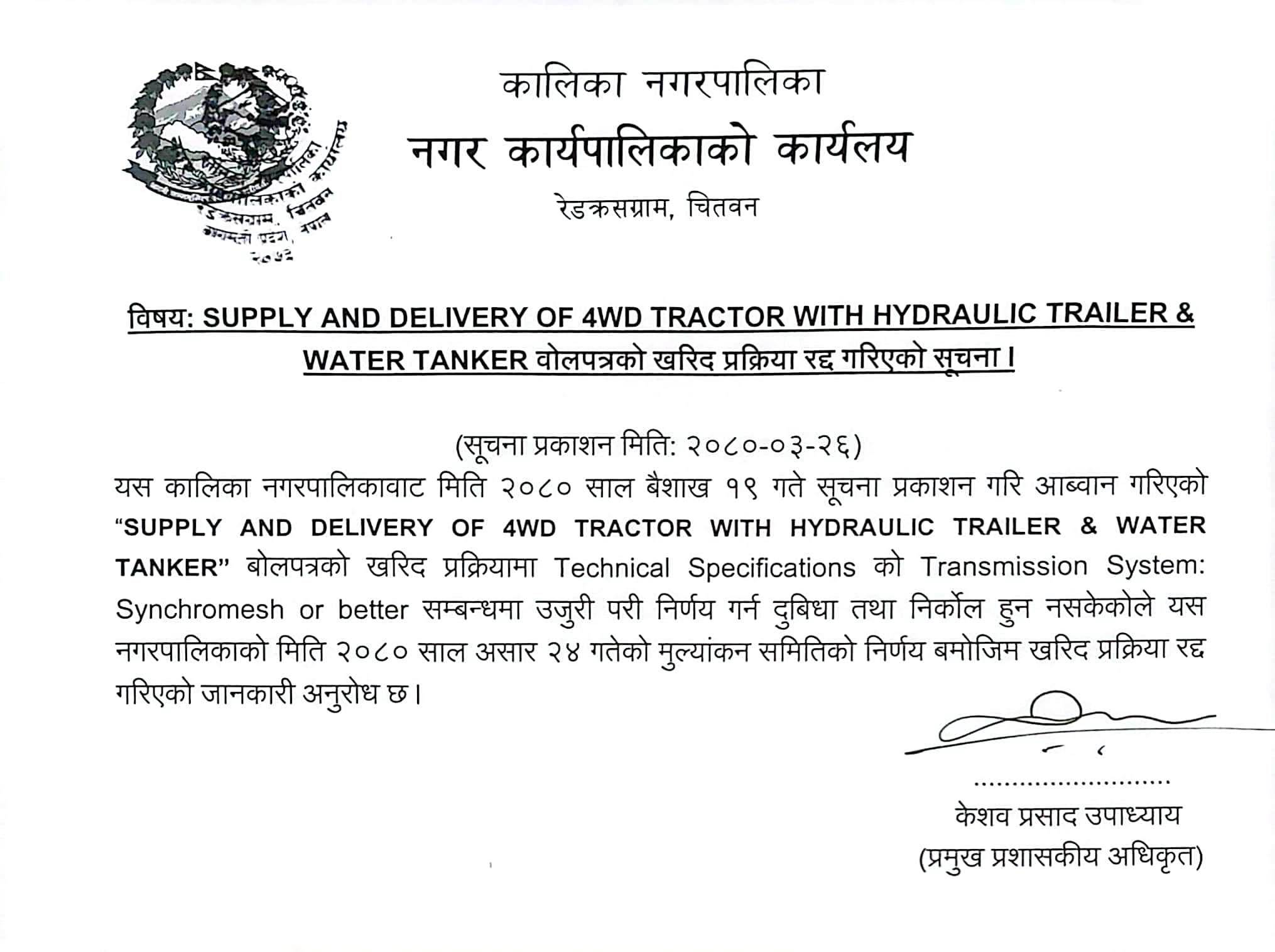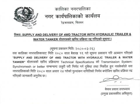 Supply and delivery of 4WD tractor with hydraulic trailer and water tanker वोलपत्रको खरिद प्रक्रिया रद्ध गरिएको वारे।